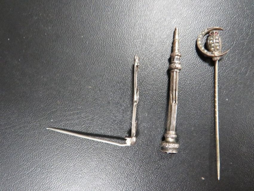 A hallmarked silver miniature propelling pencil, seed pearl silver stick pin in the form of an owl and a brooch (3)