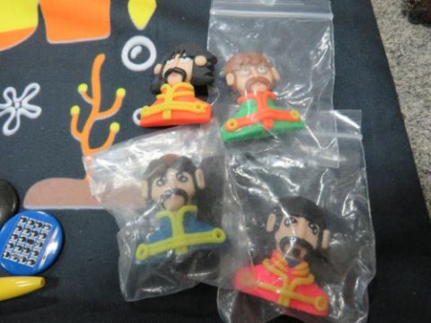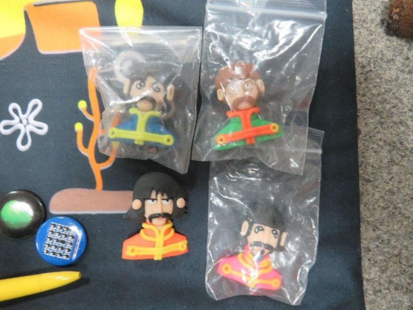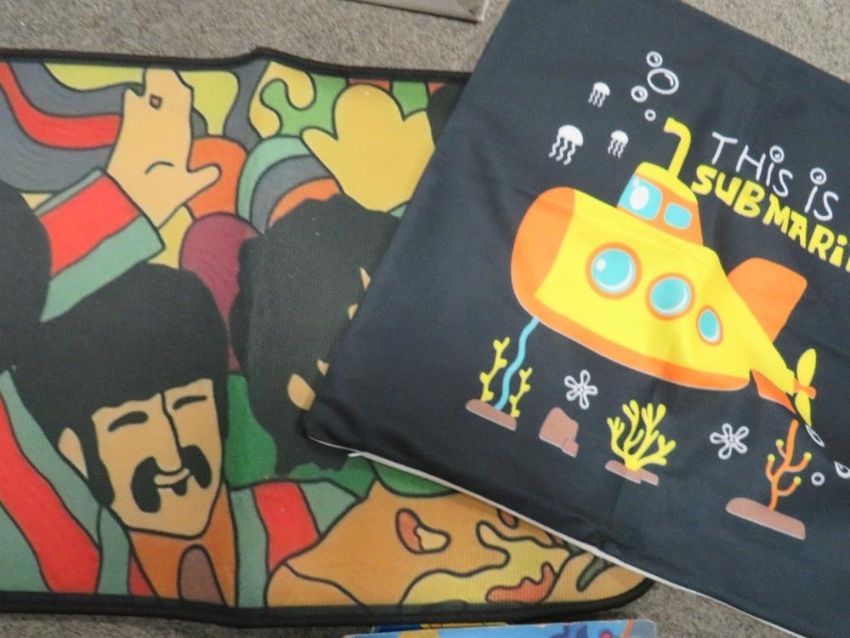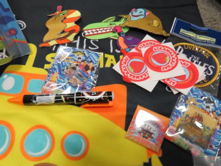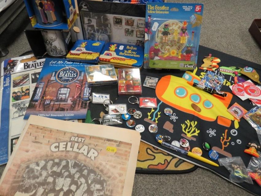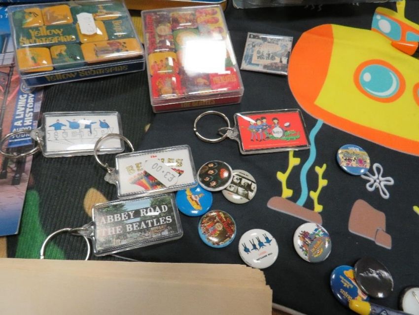 A collection of assorted modern Beatles memorabilia, to include a collection of badges, KNex figures, mugs, door mat, cushion cover etc