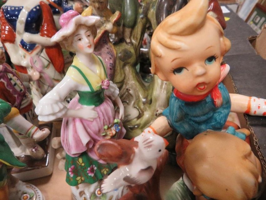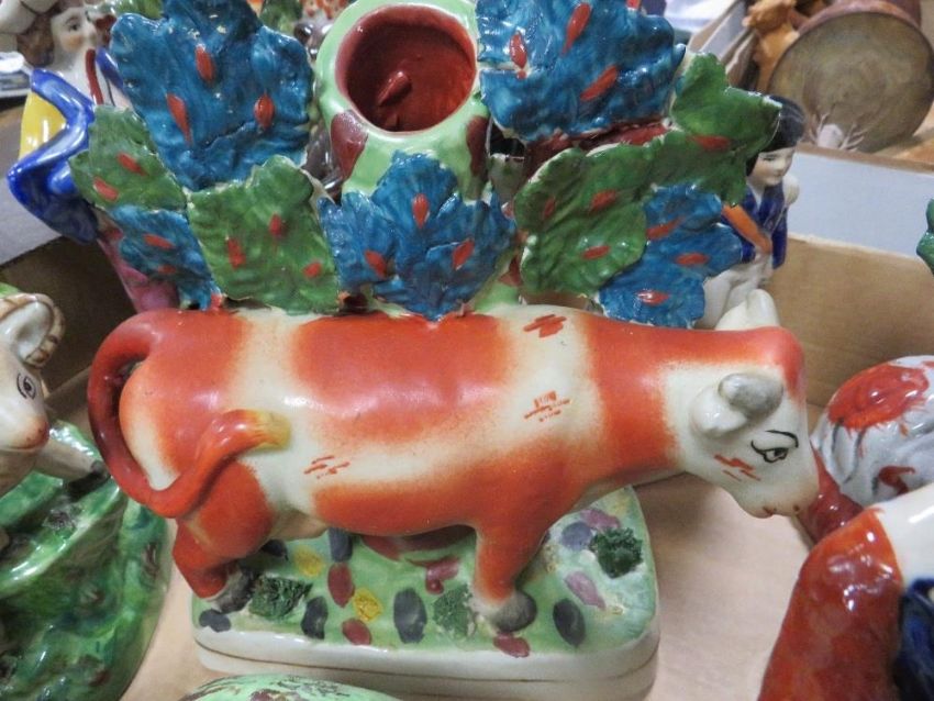 A tray of assorted Staffordshire style flatback figures etc