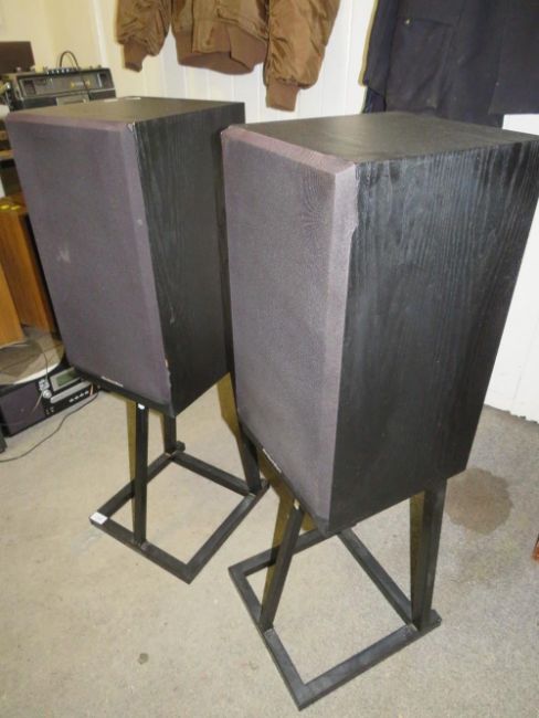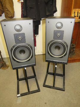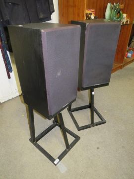 A pair of Mordaunt short MS35Ti speakers with floor stands - House Clearance