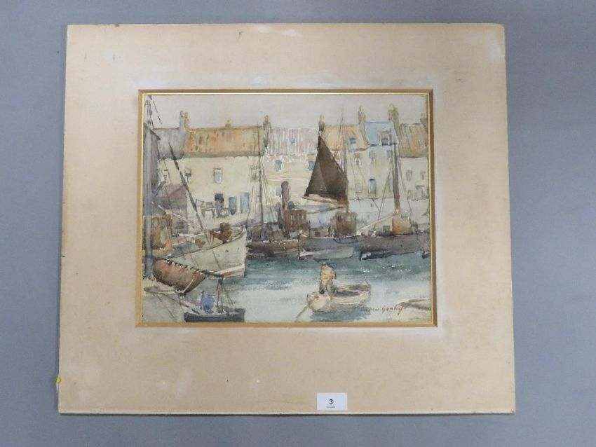 Andrew Garnlay ? A Cornish school watercolour depicting a fishing harbour 30 x 38 cm