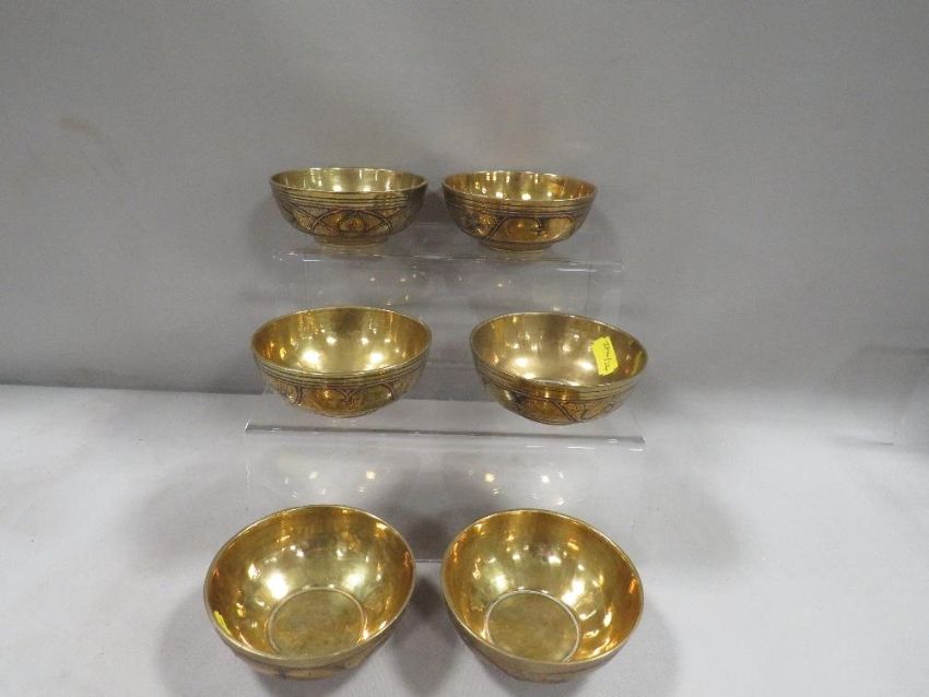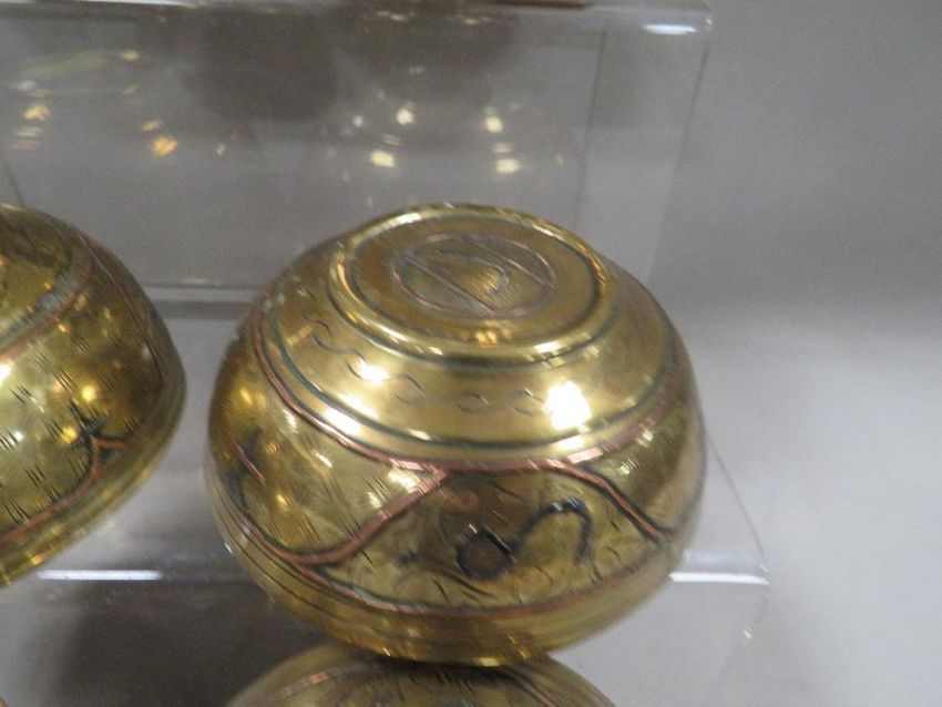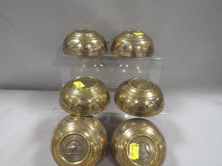 Six Cairo ware bowls, with typical whit metal & copper overlay decoration