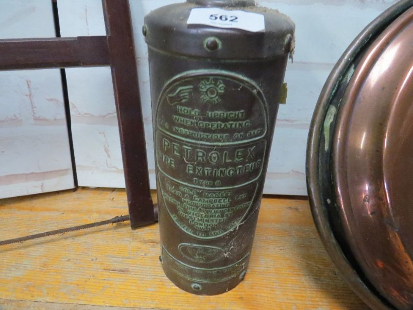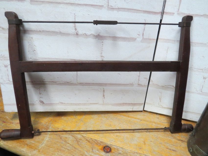 A vintage T handled wood auger, a vintage bow saw, a vintage fire extinguisher and a vintage bed warmer pan