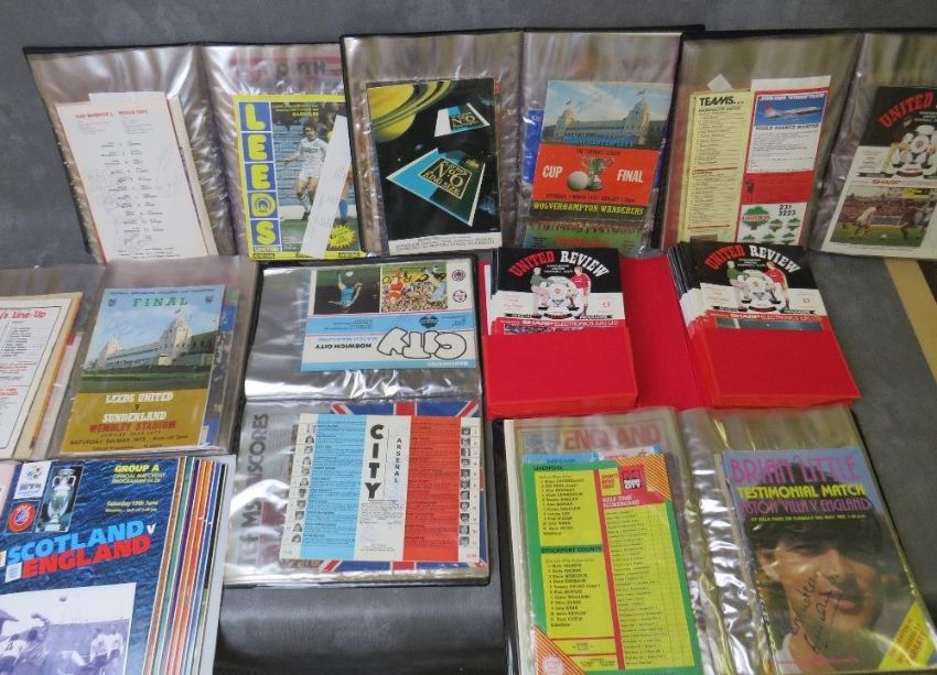 EIGHT ALBUMS OF FOOTBALL PROGRAMMES, many signed / autographed to include FA Cup finals, Tetimonail matches, Manchester United collection / International matches