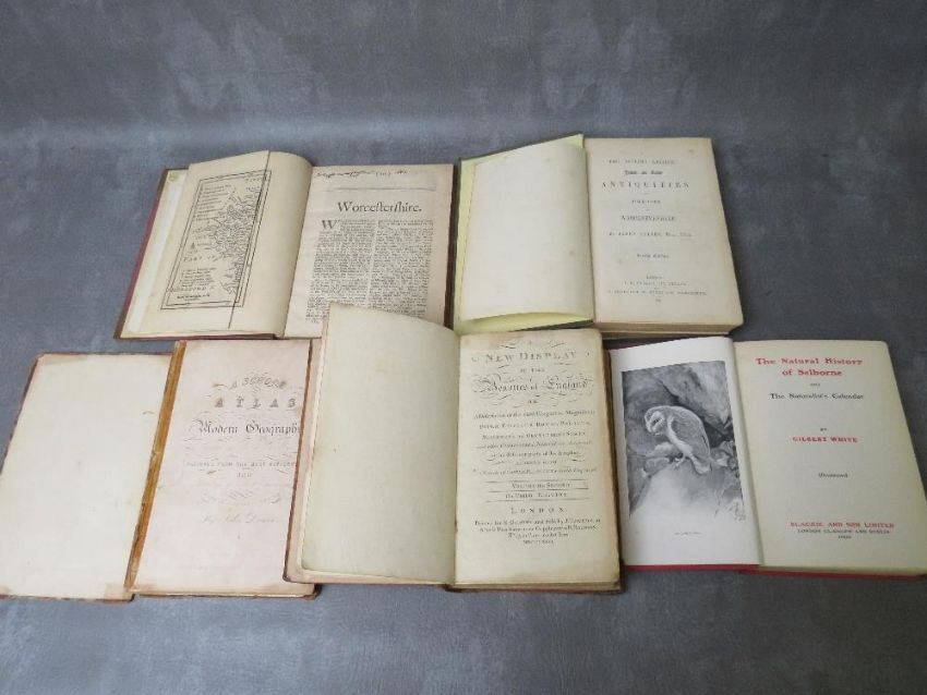FIVE TOPOGRAPHICAL BOOKS - 'A NEW DISPLAY OF THE BEAUTIES OF ENGLAND...' 2nd volume 3rd edition 1776, Thomas Cox 'Worcetershire' with Robert Morden map c.1760, 'The Ancient British, Roam & Saxon Antiquitis and Folk-Lore of Worcestershrie' by Jabez Allies, 2nd ed. 1852, John Dower School Atlas A/F and White's 'Natural History of Selbourne' 1903 (5)