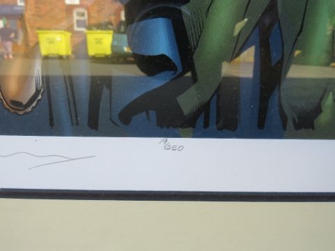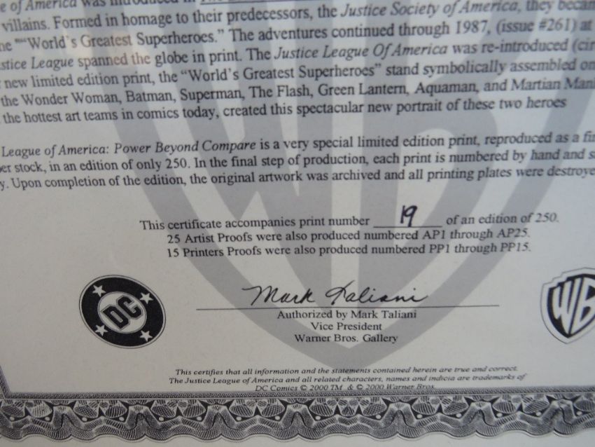 A LARGE FRAMED AND GLAZED WARNER BROS LIMITED EDITION LITHOGRAPH 'THE JUSTICE LEAGUE OF AMERICA: POWER BEYOND COMPARE', signed to lower edge by both Bryan Hitch and Paul Neary, number 19 of an edition of 250, with certificate to reverse, overall dimensions H 92 x 71 cm