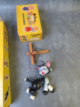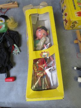 THREE PELHAM PUPPETS, boxed gypsy, boxed cat and rare unboxed green witch in red puppet bag (3)