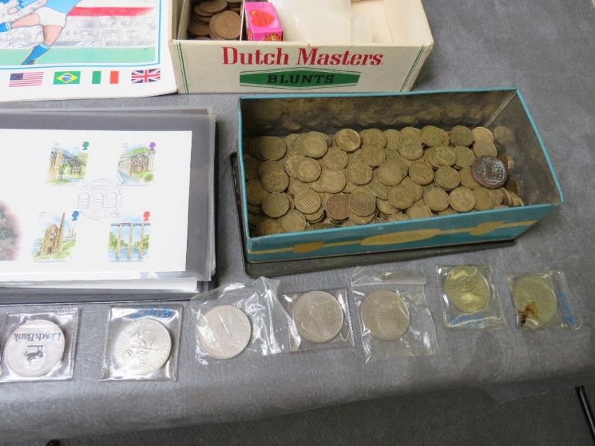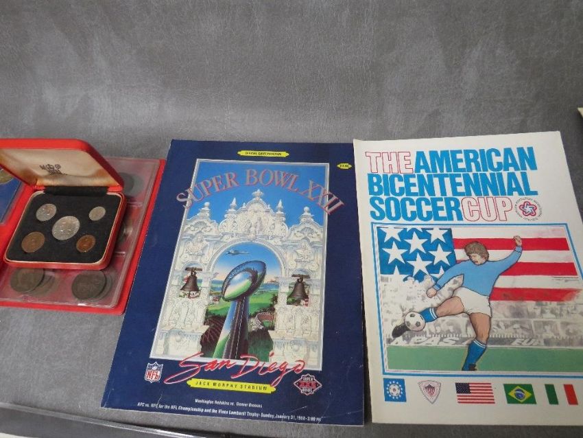 AN ALBUM OF FIRST DAY COVERS, a Superbowl XXII programme, an American bicentenial cup programme 1976, together with a selection of English and foreign coins to include fourteen crowns, a tin of English brass threepenny bits, sleeves of pennies - some Victorian, box of English halfpennys, Trinidad and Tobago 1 to 50 cent set, Argentina 1978 20 to 100 Peso set, etc.
