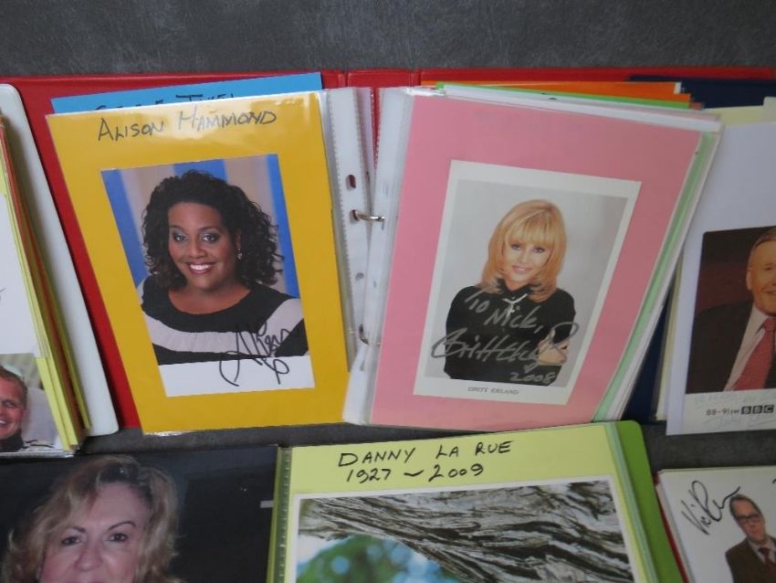 SEVEN ALBUMS OF AUTOGRAPHED PHOTOGRAPHS, PROGRAMMES, CUTTINGS AND CARDS, autographs are of actors / actresses, sportstars, pop stars, models etc., to include Alec Guinness, Janet Leigh, Richard Todd, Danny La Rue, Viki Michelle, Fatima Whitbread, Freddie Star, Britt Ekland, Samantha Fox, Martina Navratilova, Jimmy Young, Paul Gascoigne, Hugh Lloyd, Sally Gunnell, Peter Andre, Sheila Ferguson, Leslie Grantham, Tom Baker, Joe Brown, Rosemary Leach etc.