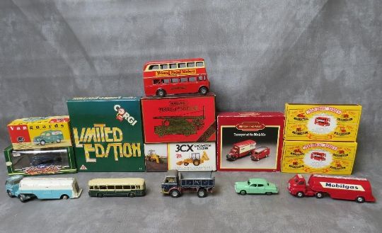 MIXED DIE CAST / TIN PLATE JOB LOT, to include unboxed vintage Triang clockwork tin plate double decker bus, boxed JCB 3CX excavator, boxed Matchbox 1936 Leyland fire engine, Corgi British Rail two vehicle set, two boxed Matchbox 40th anniversary sets, boxed Vanguard Austin A40, boxed Corgi Ford Popular, together wtih unboxed Dinky Studebaker, Dinky Parisien coach, Dinky Ford 800, Corgi Major Mobil Gas Bedford tractor unit etc