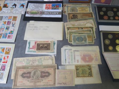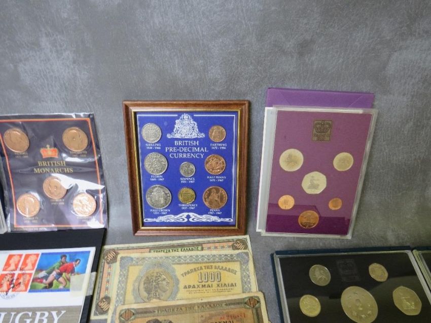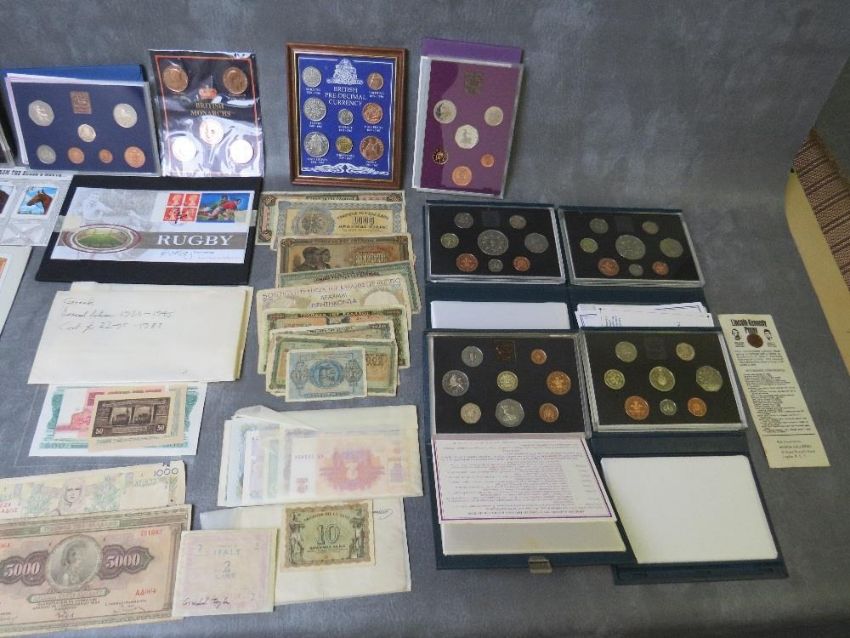 A COLLECTION OF COINS, BANK NOTES AND STAMPS, to include proof sets 1971, 1980, 1982, 1993, 1194 etc