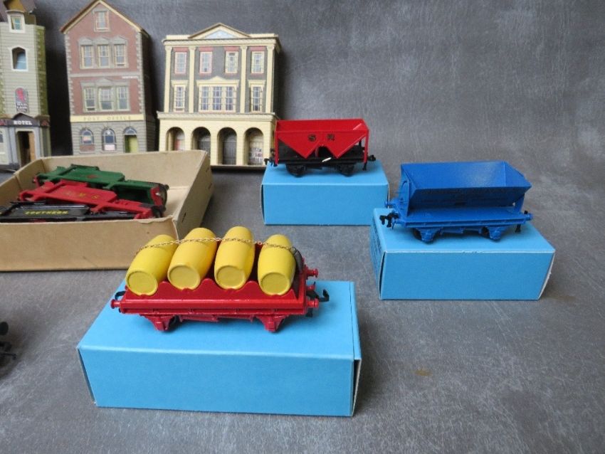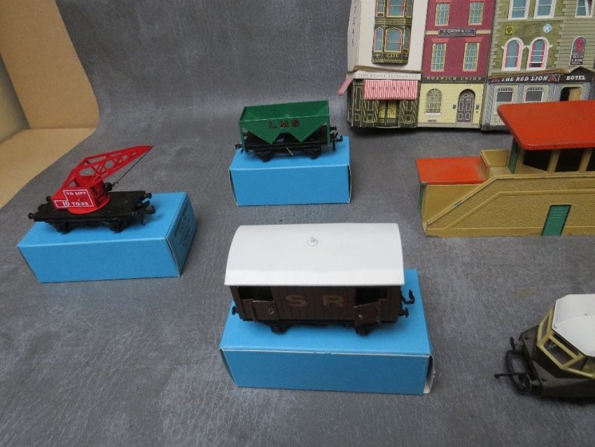 UNBOXED OO GAUGE LIMA DIESEL LOCOMOTIVE, six boxed Hornby OO gauge rolling stock to include two wagon hoppers, crane, brake van, side tipper, barrel holder, together with Hornby metal signal box, buildings and three tank / shunter tops