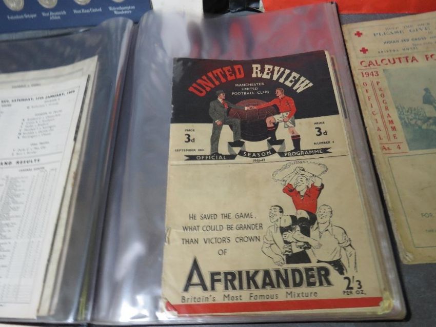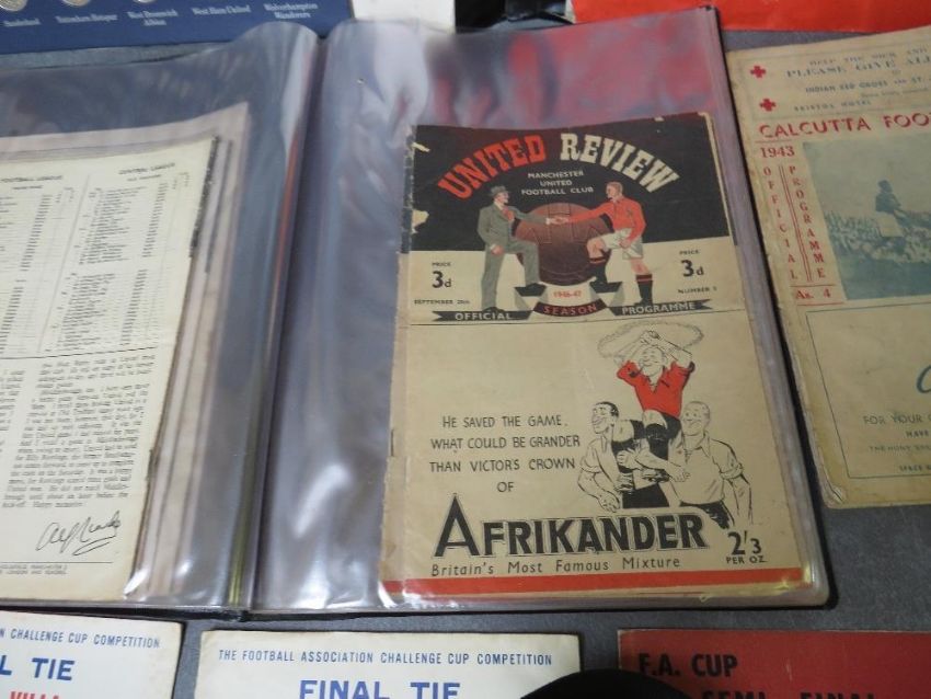 THREE ALBUMS OF VINTAGE FOOTBALL PROGRAMMES, to include England v Scotland August 24th 1946 Bolton Disaster match, FA Cup final 1957 Aston Villa v Mancheter United, five Mancheter United home programmes from the 1946 / 1947 season, an interesting 1943 Calcutta football league programme A/F etc., together with an Esso FA Cup winners medal collection complete and an Esso 1970 World Cup England squad medal collection with one medal missing - Peter Shilton
