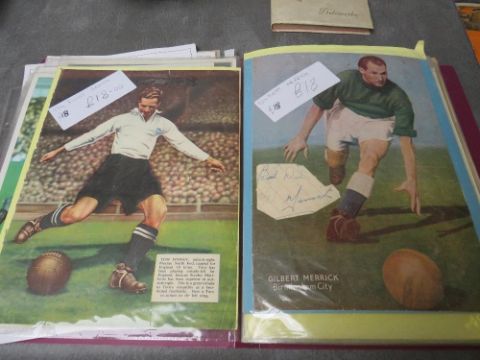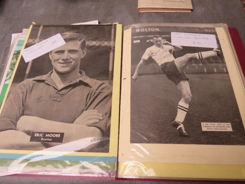 AN ALBUM OF SIGNED FOOTBALL PHOTOGRAPHS / PICTURES, to include Stan Matthews, Tom Finney, Gil Merrick, MNat Lofthouse, Johnny Haynes, Dennis Law, Jimmy Greaves, Jimmy Armfield, et., a signed West Bromwich Albion caseball - signatures include Bob Taylor and Richard Sneekes, a collection of TV star photographs - many signed, a few football programmes to include reproduction England v West Germany 1966 World Cup final programme, an autograph book to include Edward Woodward, Ann George, Larry Grayson, Roger Tongue, Stanley Unwin signatures and a miniature signed rugby ball