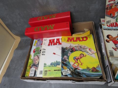 TWO TRAYS CONTAINING A SELECTION OF VINTAGE COMICS / MAGAZINES / PAPERBACK BOOKS, to include MAD and Cracked