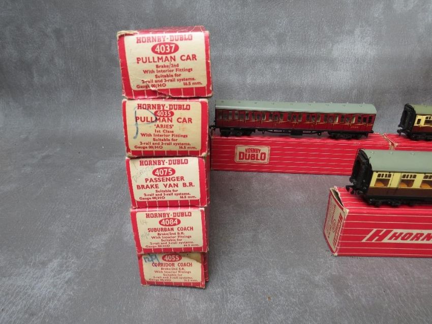 THIRTEEN BOXED HORNBY DUBLO CARRAIGES, to include restaurant coach, corridor coach, Pullman car, surburban coach, passenger brake van, open corridor coach etc