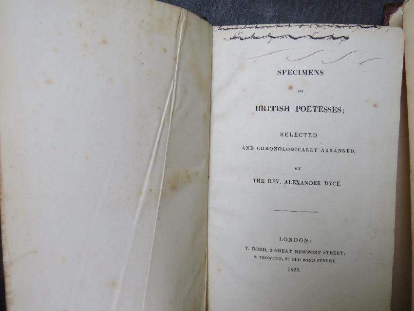 FOUR ANTIQUARIAN VOLUMES - 'MIRACULOUS PROPERTIES AND PREDICTIONS OF EMINENT MEN...' 1821, A/F, poems Moral and Descriptive by the late Richard Jago' 1804 A/F, 'Specimens of British Poetesses' by Rev. Alexander Dyce 1825 and 'Some Specimens of the Poetry of Ancient Welsh Bairds' by Rev, Evan Evans, published by John Pryse (4)