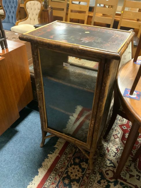 A bamboo and lacquered glazed single door cabinet together with two Eastern occasional tables