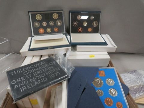 A collection of Royal Mint proof sets 11970's 1990;s, along with a small quantity of uncirculated coins