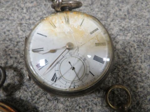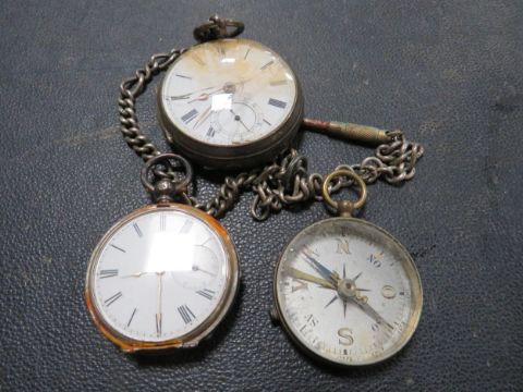 Two vintage pocket watches for restoration together with a vintage compass