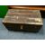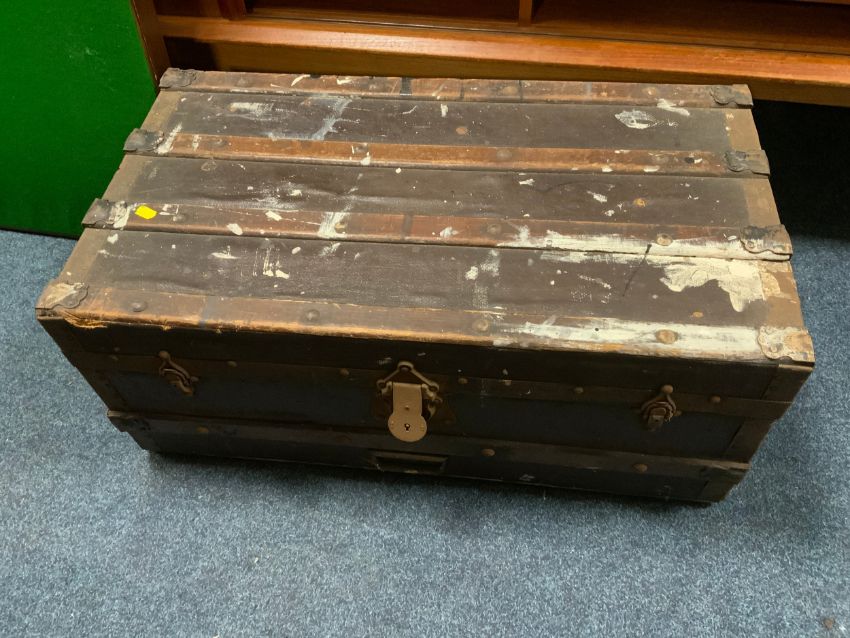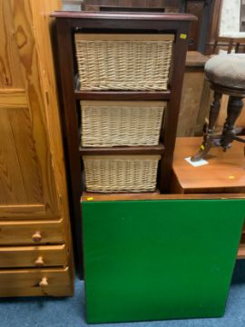 A modern wicker shelving unit together with a folding card table and a packing trunk (3)