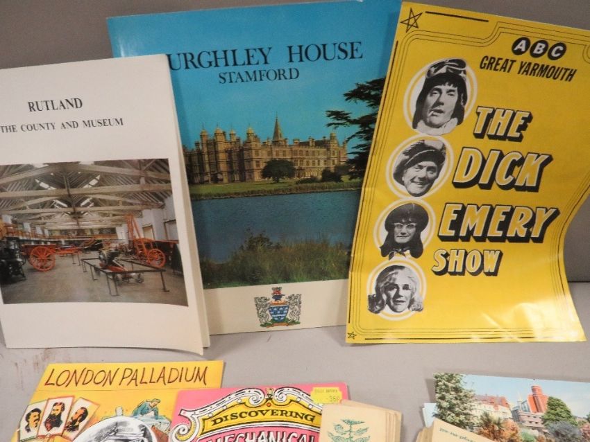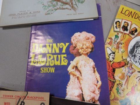 A small tray of ephemera to include silk cigarette cards, postcards etc together with a small vintage case and contents to include military belts etc