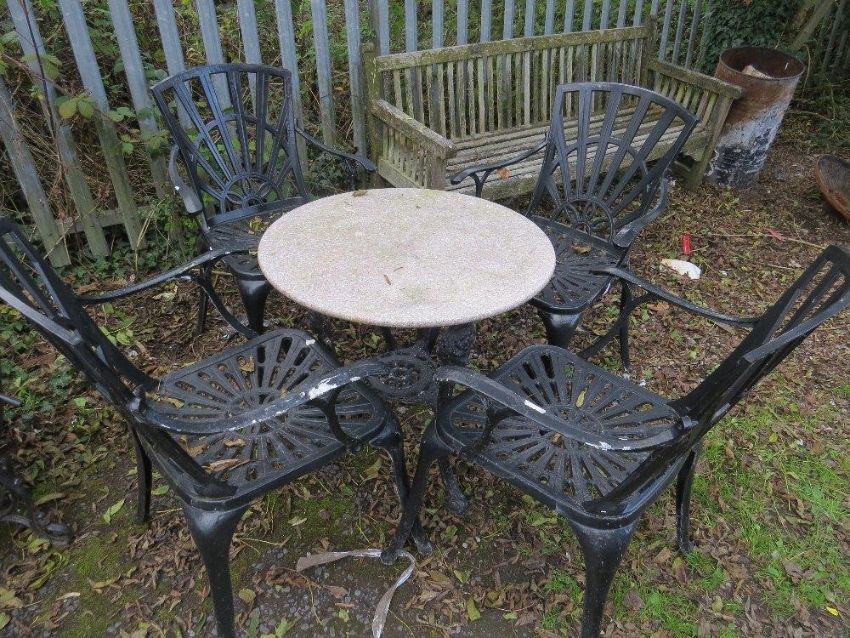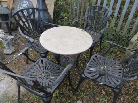 A cast aluminium gardne table and four chairs