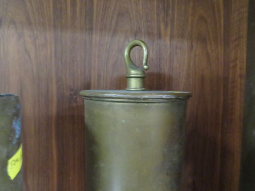 A WW1 1917 trench art shell case gong, along with two large cannon shells (3)