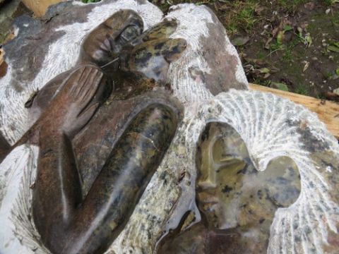 A large stone type statue of a tribal family - H 110 cm, W 106 cm