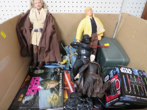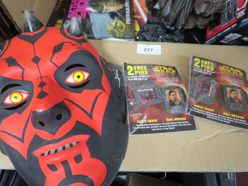 A tray of unboxed Star Wars figures to include Darth Mack and Dark Vader, books, mug, money box etc