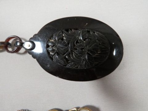 A vintage gilt metal / pinchbeck style bracelet with inset panels having figural embellishment, together with a vintage faux tortoiseshell pendant and chain (2)