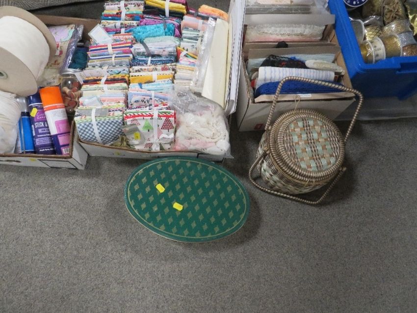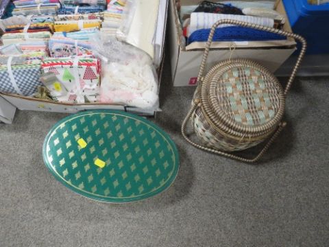 A collection of Fat Quarters fabrics, lace to include a vintage sewing basket etc