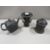 A Wedgwood style black Basalt teapot with Oriental style decoration to panels and dog finial - unmarked, together with a similar lidded tobacco jar and a twin handled urn - both damaged (3)