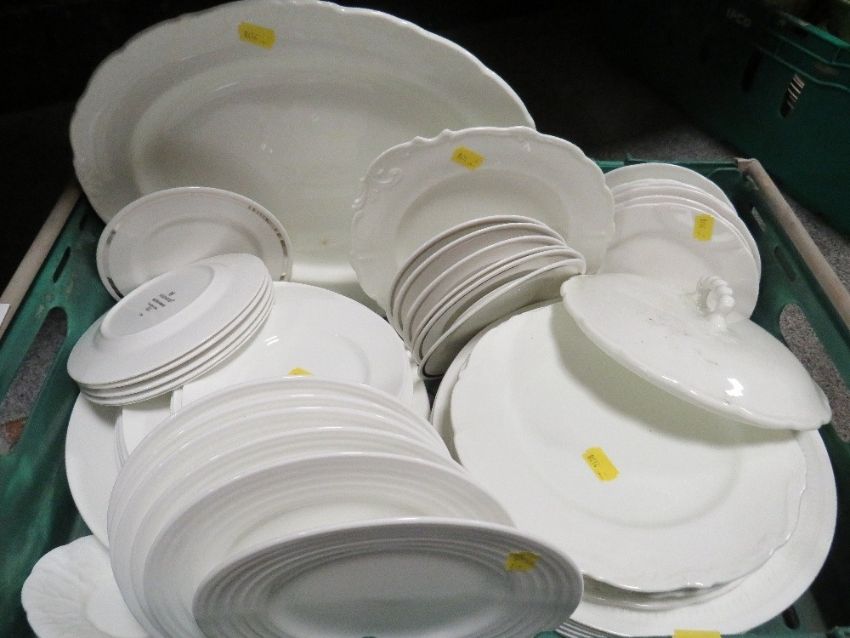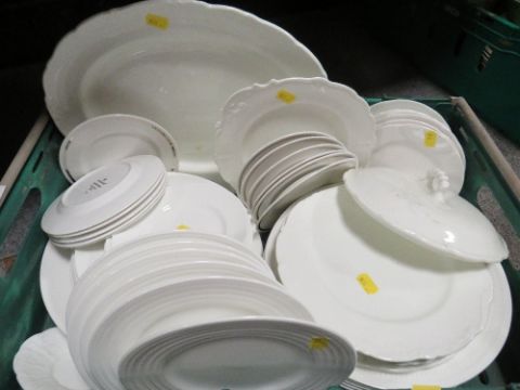 A tray of assorted white dinner ware to include Wedgwood British Airways