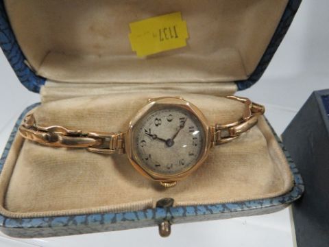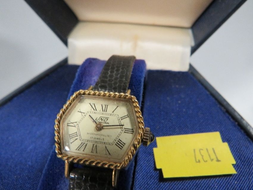 A 9ct gold octagonal wristwatch on expandable metal bracelet together with an Uno example (2)