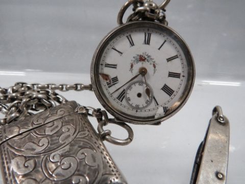 A manual wind fob watch A/F on silver belcher chain with small hallmarked silver vesta case together with a small hallmarked silver fruit knife