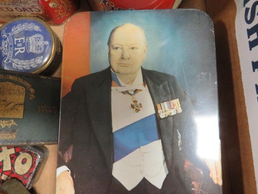A tray of assorted collectable vintage tins together with a glass vase