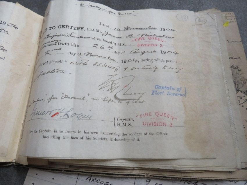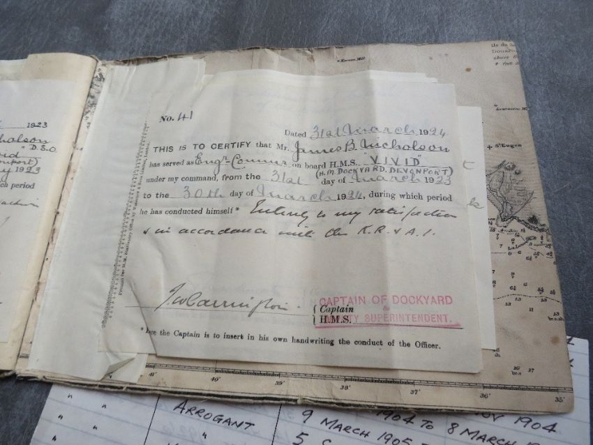 A BOUND COLLECTION OF ROYAL NAVY SERVICE PAPERS 1898-1926, relating to James B Nicholson (First listed as 'Prob. Asst. Eng. retiring as Eng. Captain), along with a dog tag inscribed 'Engr Comdr J. B. Nicholson C of E'