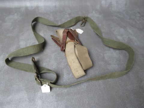 A WW2 GERMAN MG42 SPARE BARREL CARRY CASE, a small enamel sign A/F, an SMG sling and a set of braces