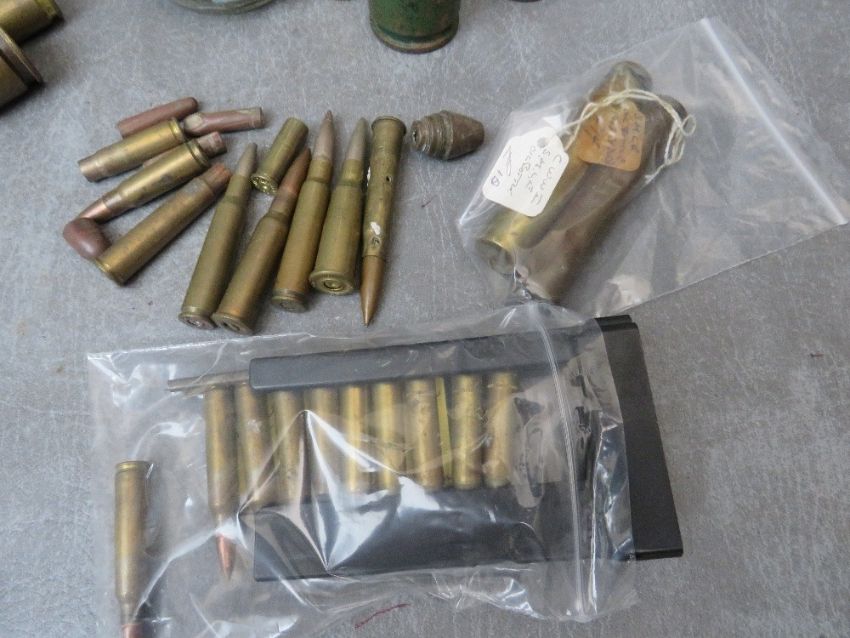 A BOX OF INERT SHELL AND BULLET CASES, to include a 30mm armour piercing round, SA80 rounds in speed loader etc. (All inert)