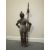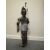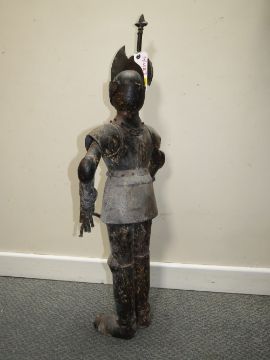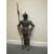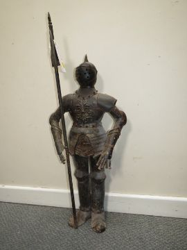 A DECORATIVE METAL FIGURE OF A STANDING KNIGHT IN ARMOUR HOLDING A POLE ARM, H 89 cm