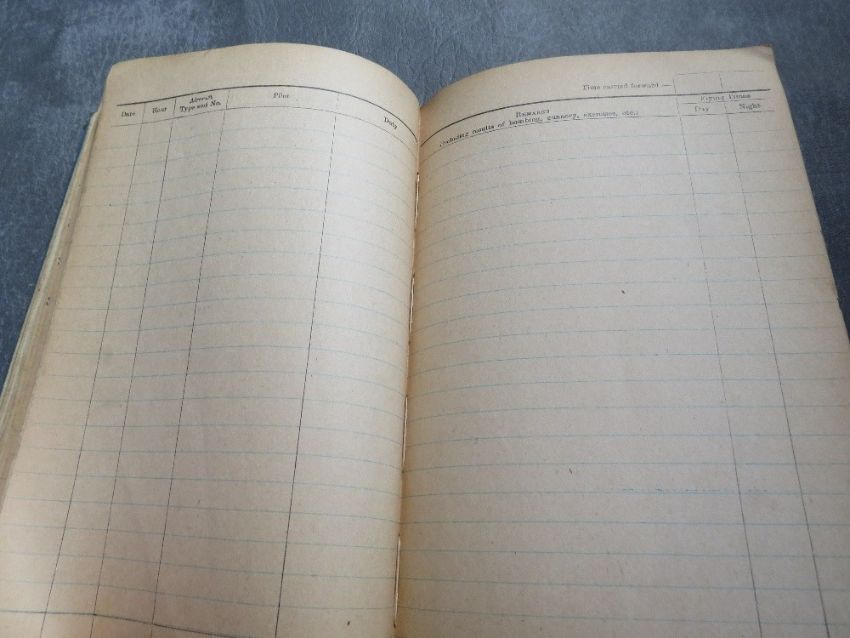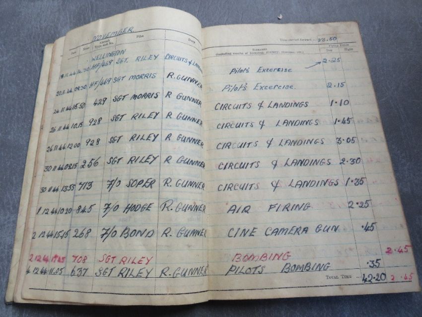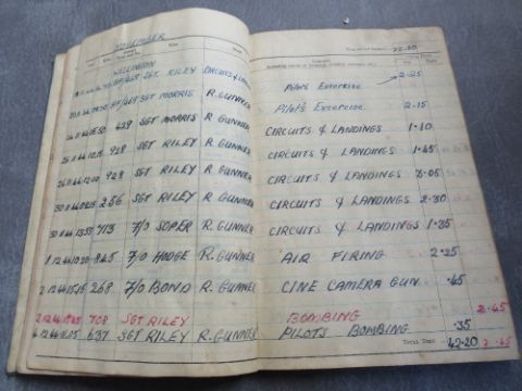 A WWII RAF LANCASTER GUNNER LOGBOOK - SERGEANT A. BELL, filled in from August 1944 to July 1945. An entry dated 8/5/1945 for Operation Manner from Heaven over Rotterdam