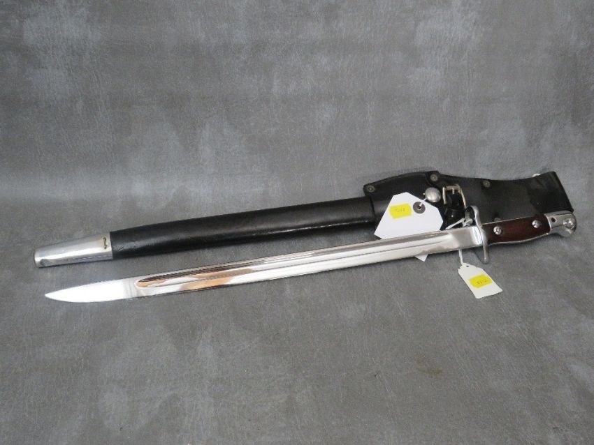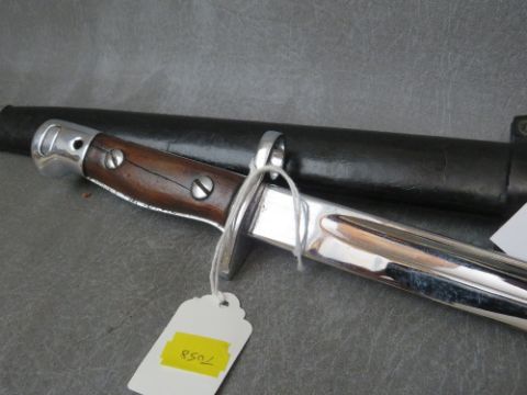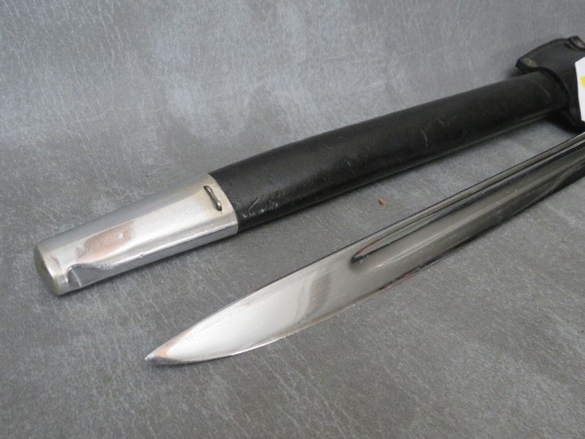 A NICKEL-PLATED PARADE BAYONET, in scabbard with frog