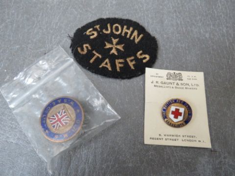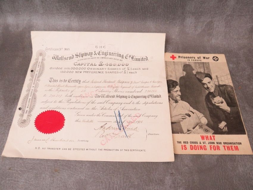 A WWI WALSALL SLIPWAY AND ENGINEERING Co. ENAMEL WAR SERVICE BADGE AND SHARE CERTIFICATE, along with a WW2 St. John P.O.W. badge and leaflet (2)