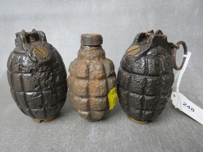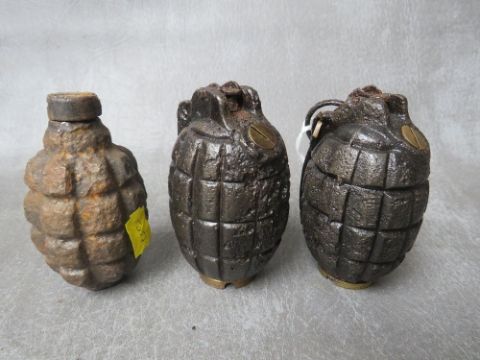 TWO MILLS BOMB GRENADES, dated 1916 A/F, along with another grenade, all A/F, all inert (3)