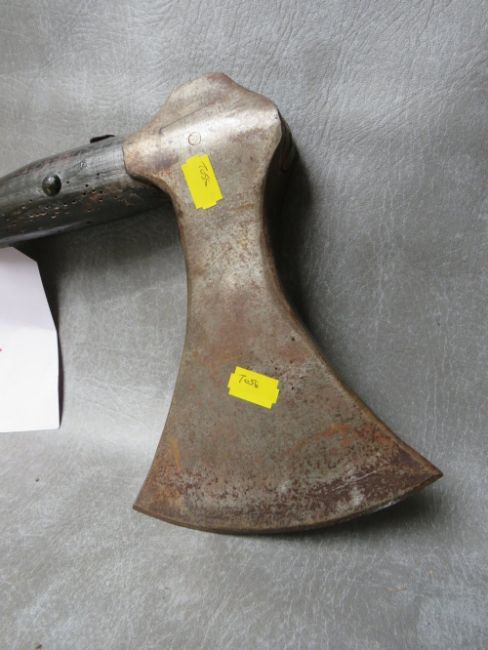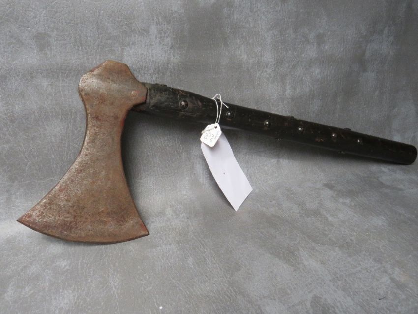 A REPLICA VIKING WAR AXE, an iron head in wooden handle with metal stud decoration to the shaft, L 58 cm