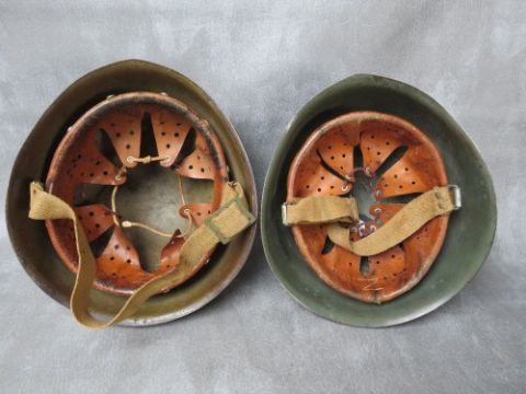 TWO ITALIAN WW2 TYPE GREEN PAINTED TIN HELMETS, with leather liners (2)