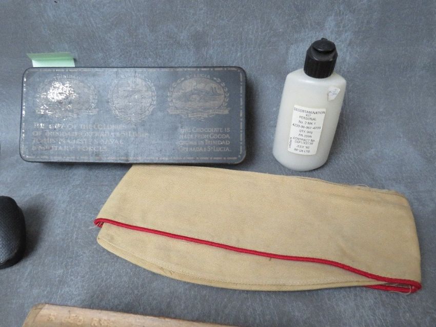 A BOX OF MILITARY INTERST COLLECTABLES, to include a WWI era Colonies chocolate tin, Bully beef tin opener, button sticks etc.
