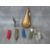 AN ANTIQUE COPPER POWDER FLASK, with embossed decoration and a quantity of pen / pocket knives