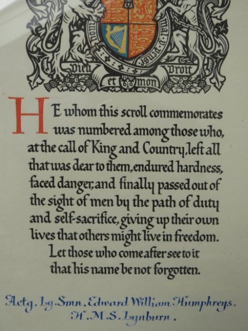 A WW1 MEMORIAL SCROLL, named to ACTG. LG. SMN. EDWARD WILLIAM HUMPHREY H.M.S. Lynburn, framed and glazed